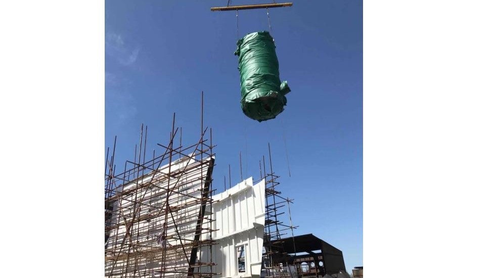 - Exhaust gas from the ship’s engine is directed into the scrubber unit at the rear of the main funnel.