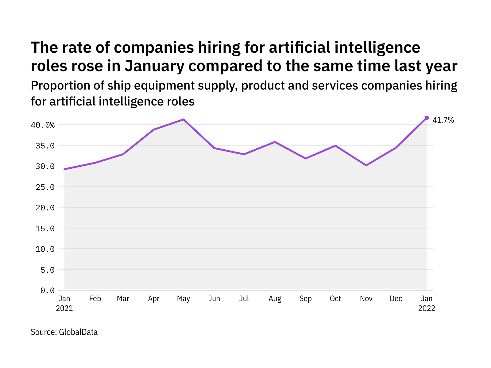 The proportion of ship equipment supply, product and services companies hiring for artificial intelligence related positions rose significantly in January 2022 compared with the equivalent month last year, with 41.7% of the companies included in our analysis recruiting for at least one such position.