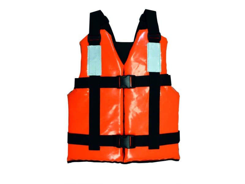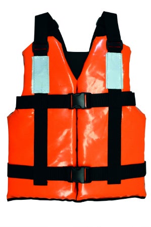 The vest is equipped with a special wipe-clean PVC outer cover fabric and a lighter polyester inside fabric. It is UV / mould / oil resistant and highly visible due to its glossy orange colour and SOLAS retro-reflective tapes. The internal PE foam offers a buoyancy of 64N, which is much higher than the minimum requirement of the ISO standards.