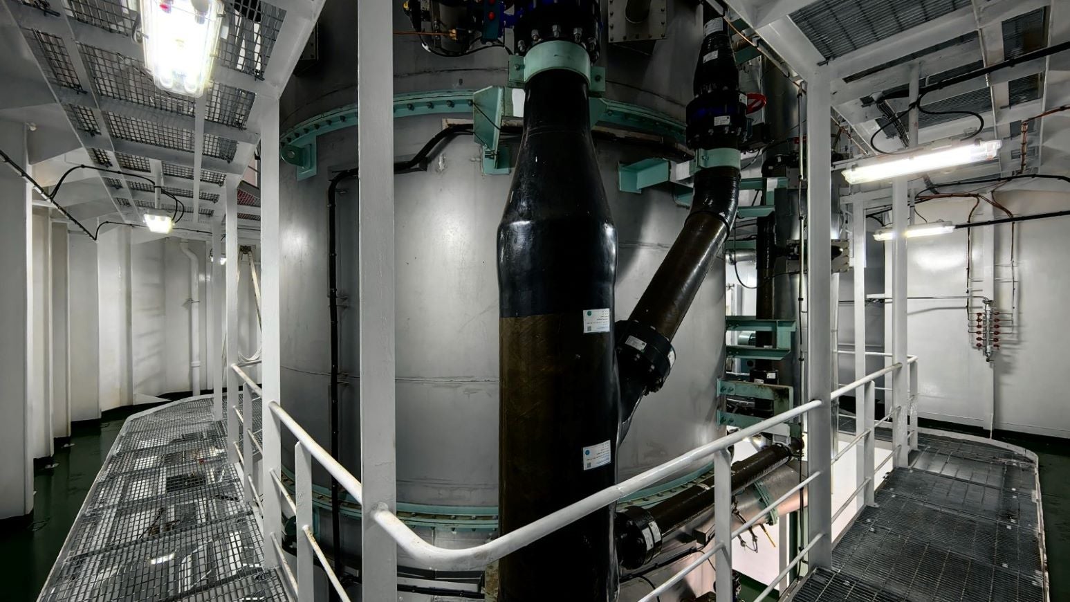 - Exhaust gas from the ship’s engine is directed into the scrubber unit at the rear of the main funnel.