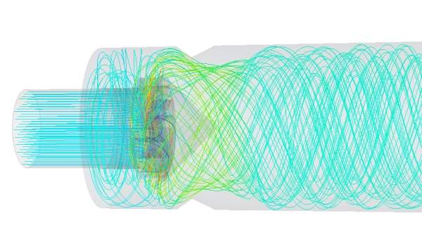 - Droplet separator: the fluid is forced up the funnel in a spiral pattern, which allows unwashed sulphuric acid and particles to dynamically separate and slide down the sides of the funnel to the base of the turbo scrubber. The sulphurous fluid is then fed for conventional water treatment, including filtration and sludge-tank storage