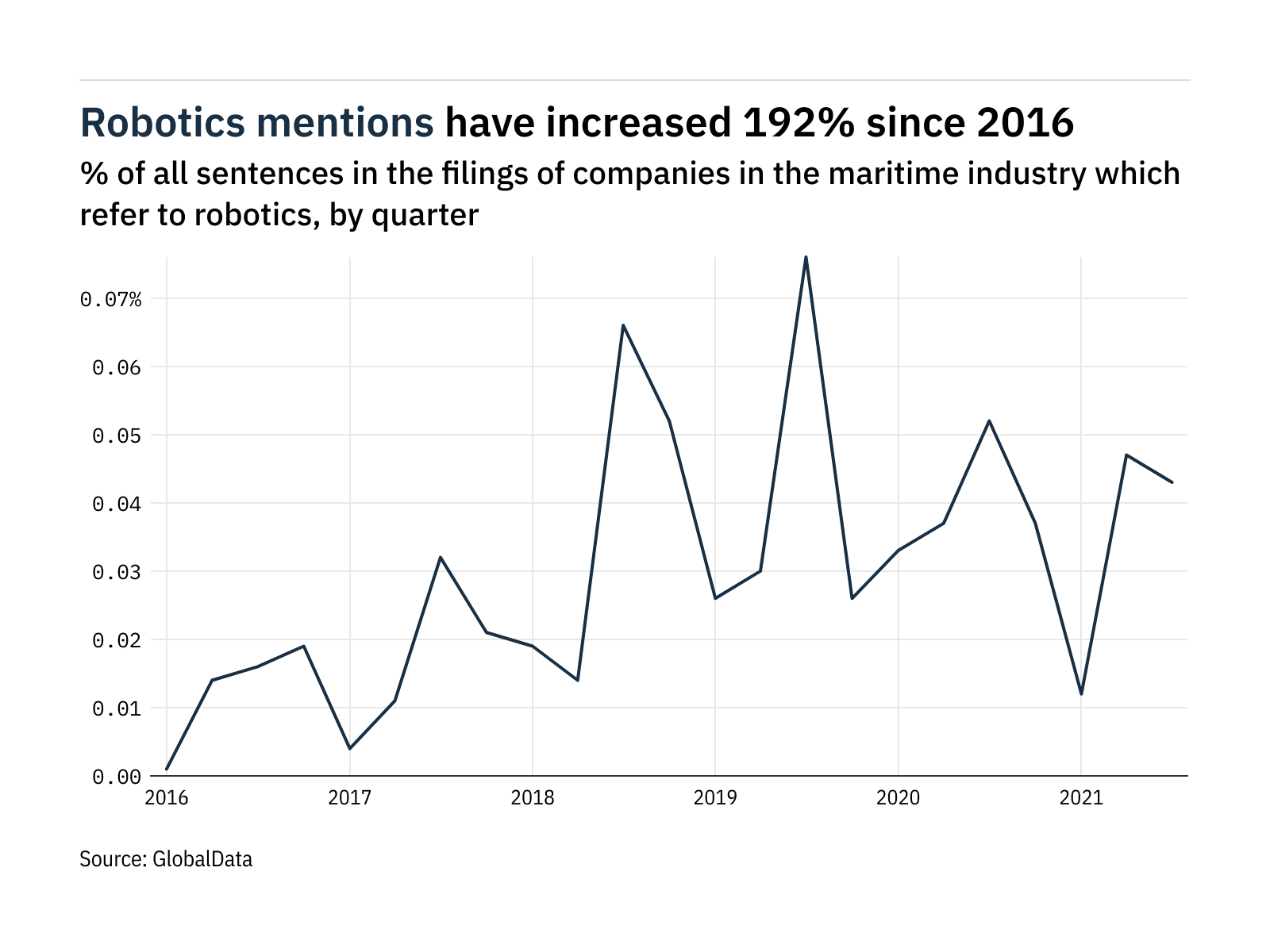 Mentions of robotics within the filings of companies in the maritime industry were 192% higher between October 2020 and September 2021 than in 2016, according to the latest analysis of data from GlobalData.