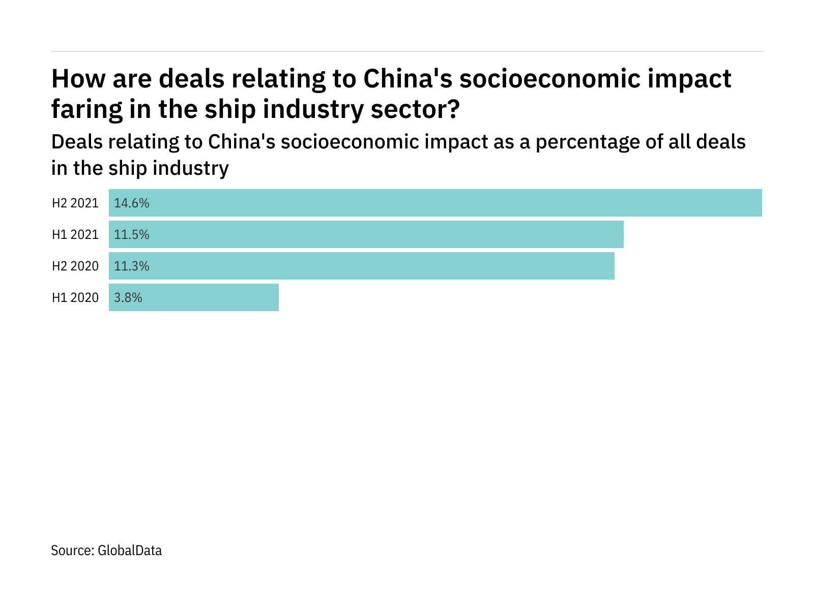 During second half of 2021, deals relating to China's socioeconomic impact accounted for 14.6% of all deals taking place in the sector. This represents an increase from the figure of 11.3% in second half of 2020.