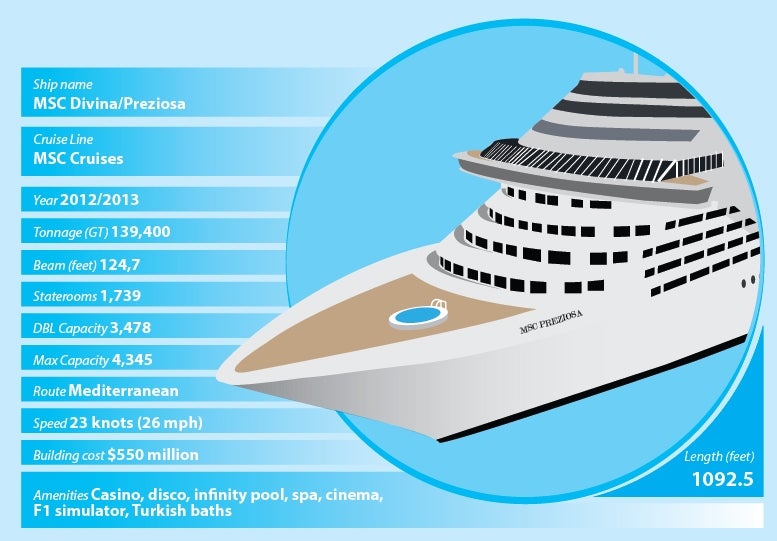 MSC Divina and MSC Preziosa are two identical cruise ships of the Fantasia-class operated by MSC Cruises. MSC Divina entered service in May 2012, while Preziosa was introduced in March 2013. Both ships operate on Mediterranean voyages.