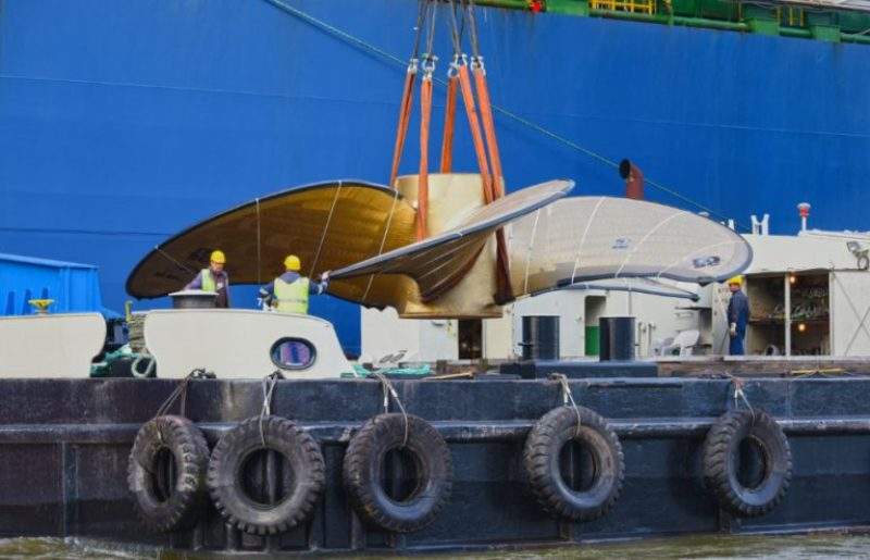 “On Sunday morning, the ‘HHLA IV’ floating crane, which can lift up to 200t, moved the world’s biggest propeller onto its transport platform and brought it to the berth of the ‘Hyundai Supreme’ at the port of Waltershof.