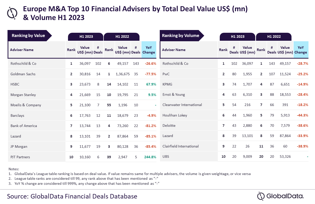 Rothschild & Co was the top mergers and acquisitions (M&A) financial adviser in Europe in H1 2023, according to GlobalData’s latest league table.