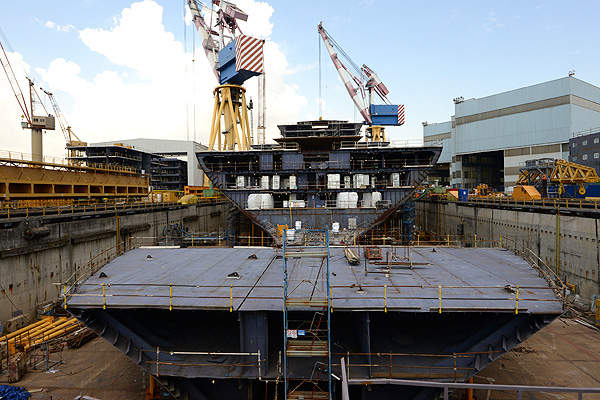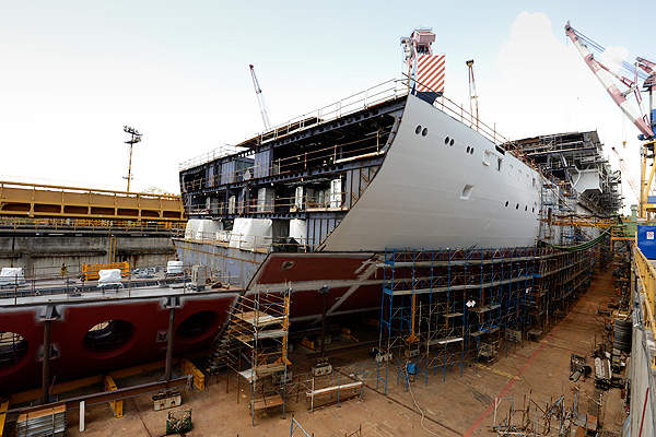 The first block of the vessel’s hull was laid in December 2012. The building block measured 29m in length, 15.7m in width and weighed about 504t.