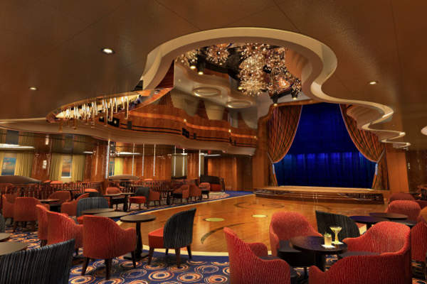 A rendering of the two-floor Queen's Lounge theatre aboard the ship.