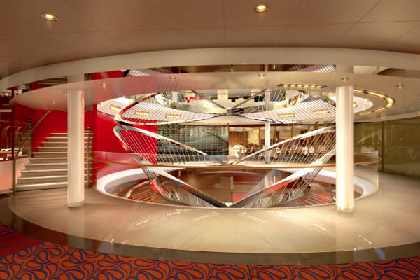 The central atrium with a ceiling skylight is three decks high and adorned by an airy stainless steel sculpture. The interiors are designed by Adam D Tihany and Bjørn Storbraaten.