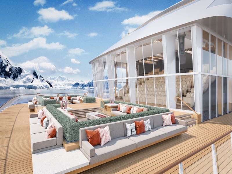 The library on the ship includes a collection of books curated by London bookseller Heywood Hill. The cruise ship features Aquavit Terrace and Pools that feature a retractable dome and three different temperature pools, including an indoor-outdoor swim-through pool.