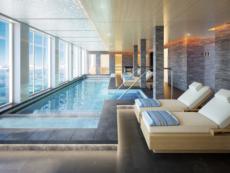 The Nordic Spa and Fitness Centre features a sauna, Snow Grotto and chaise lounges, along with a hydrotherapy pool and badestamp. The Explorer’s Lounge at the bow section is designed for the visitors to view the scenery through double-height windows.
