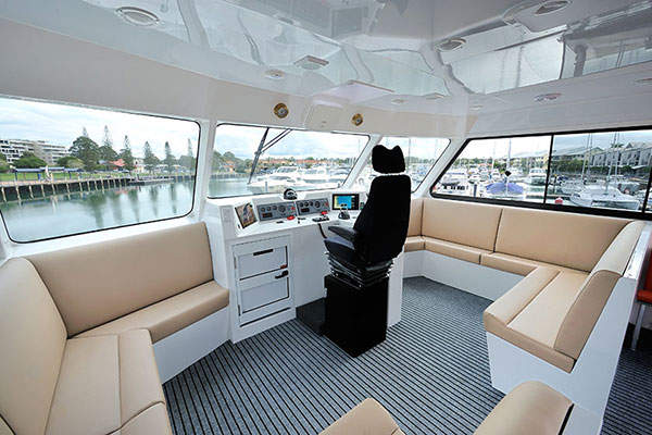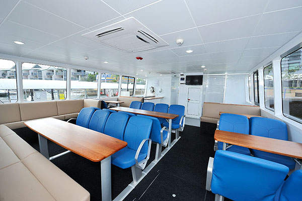 An air-conditioned saloon provides comfortable seating for up to 38 members in a lounge area, which features large panoramic windows that offer wide-angle views. Stairs lead to the upper deck and the main cabin door. The vessel also features a large aft diving deck.