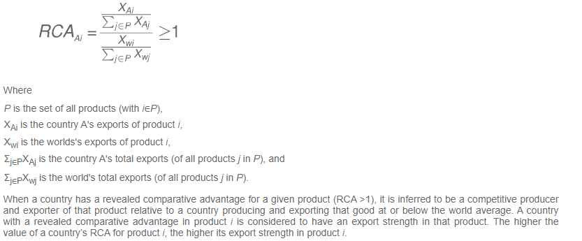 To further determine Ukraine’s commodity export prowess, we have performed a comparative advantage study to reveal the commodities in which Ukraine has export specialism. The formula for revealed comparative advantage (RCA) as per the UN Conference on Trade and Development is: